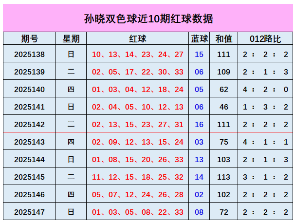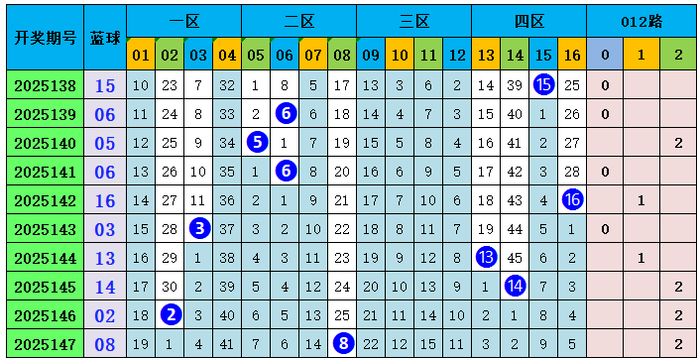 上期追忆:双色球第2025147期开出奖号:红球01、03、05、08、22、33;蓝球08,其中红球和值为72,012路比为2:2:2,奇偶比4:2,蓝球开出小偶数号码08。